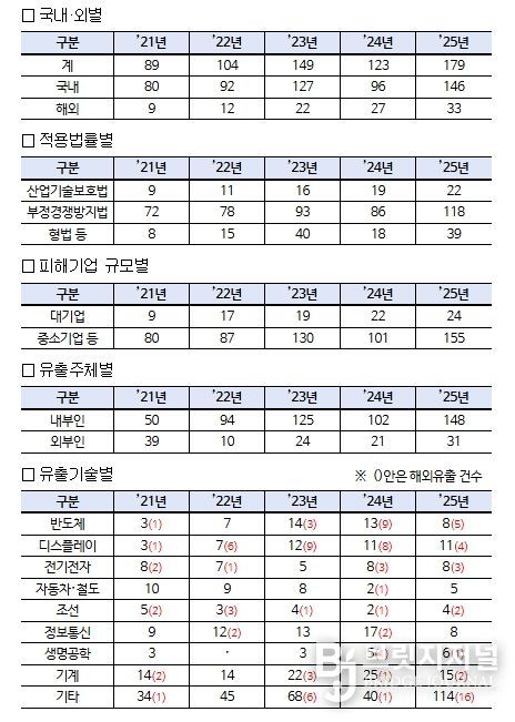 유출 기술별로는 ▵기계(15건, 8.3%) ▵디스플레이(11건, 6.1%) ▵반도체(8건, 4.5%) ▵정보통신(8건, 4.5%) ▵이차전지(8건, 4.5%) ▵생명공학(6건, 3.4%) ▵자동차·철도(5건, 2.8%) 등 순으로 나타났다.
