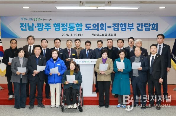 브릿지저널 김경미 기자 | 전라남도의회는 19일 도의회에서 김영록 전라남도지사와 김대중 전라남도교육감이 참여한 가운데 ‘전남·광주 행정통합 도의회–집행부 간담회’를 열고, 통합 추진 방향과 주요 쟁점에 대해 심도 있는 논의를 진행했다.