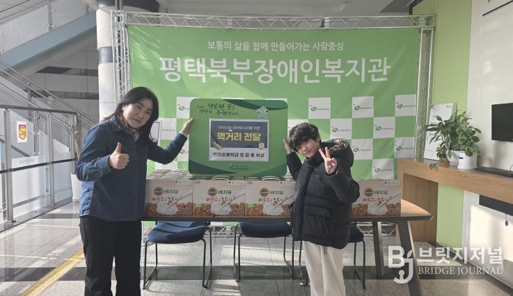 브릿지저널 김경미 기자 | 평택북부장애인복지관은 1월 16일 14시, 이충동 반지초등학교 오윤호 학생으로부터 먹거리(두유 20박스)를 후원받았다.