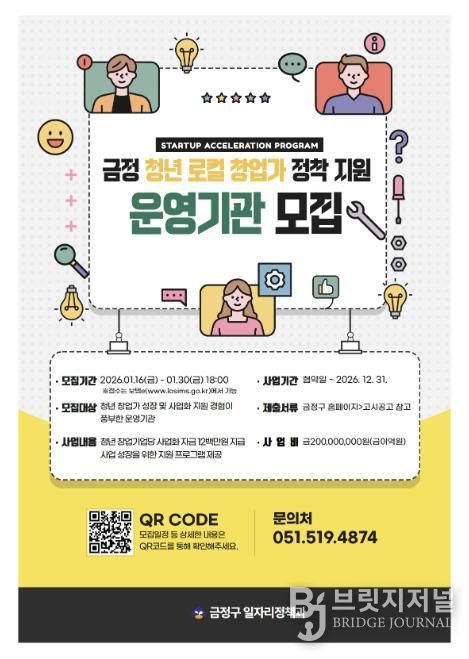 브릿지저널 윤나영 기자 | 부산 금정구는 지역에 정착할 수 있는 청년 로컬 창업가를 육성하기 위해 ‘금정 청년 로컬 창업가 정착 지원’ 사업을 추진하고, 이를 운영할 운영기관(보조사업자)을 공개 모집한다고 밝혔다.