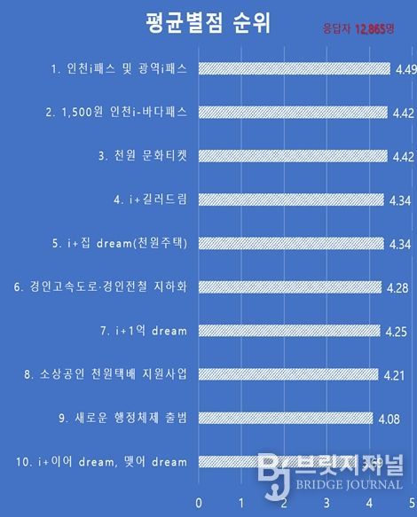 설문은 인천시가 추진 중인 10대 주요 사업에 대해 5점 만점의 별점 평가 방식으로 진행됐으며, 전반적으로 높은 점수를 받았다.