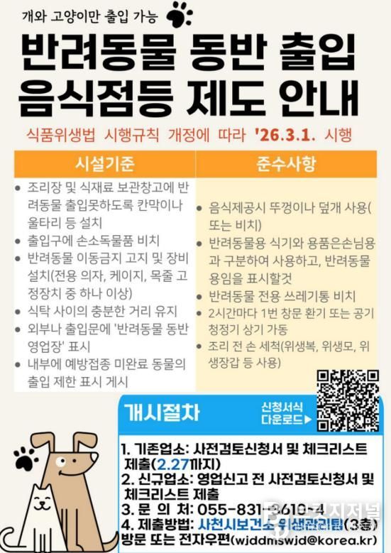 브릿지저널 김경미 기자 | 사천시는 지역 내 일반음식점·휴게음식점·제과점을 대상으로 반려동물 동반 출입 음식점을 신청받아 운영할 예정이다.