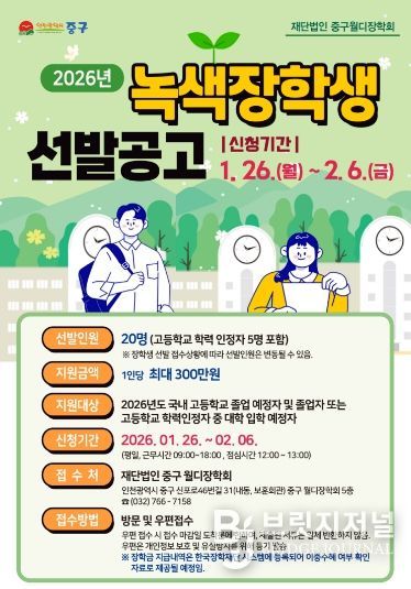 브릿지저널 김경미 기자 | 재단법인 인천 중구월디장학회(이사장 김정헌)는 지역 인재 육성을 위해 ‘2026년도 녹색 장학생’ 대상자를 모집한다고 20일 밝혔다.