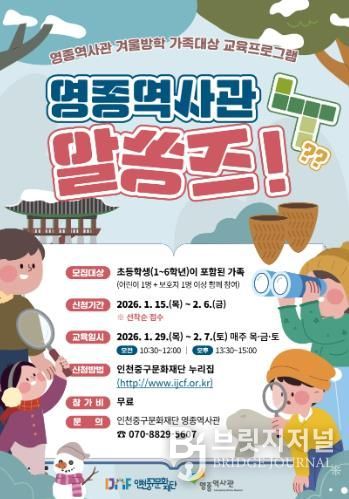 브릿지저널 김경미 기자 | 인천중구문화재단은 겨울방학을 맞아 가족이 함께 참여하는 체험형 교육프로그램 '영종역사관 알쏭즈!'의 참여자를 모집한다고 20일 밝혔다.