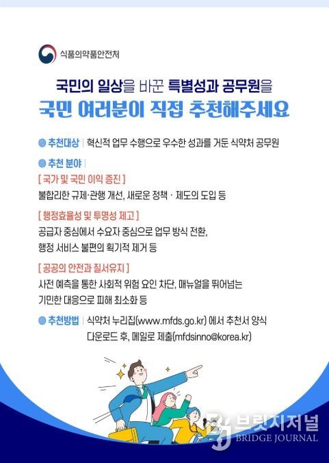 브릿지저널 김경미 기자 | 식품의약품안전처는 국민이 체감하는 탁월한 성과를 창출한 공무원을 국민이 직접 추천해 포상하는 ‘국민추천제’를 1월 20일부터 운영한다고 밝혔다.