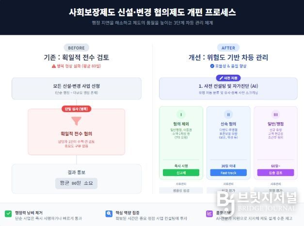 브릿지저널 김경미 기자 | 보건복지부는 급증하는 협의 건수로 인한 행정 지연을 해소하고, 더 나아가 지방자치단체가 지역 특성에 맞는 우수한 사회보장제도를 설계할 수 있도록 실질적으로 지원하기 위한 '사회보장제도 신설·변경 협의제도 개편방안'을 확정, 2026년부터 시행한다고 밝혔다.