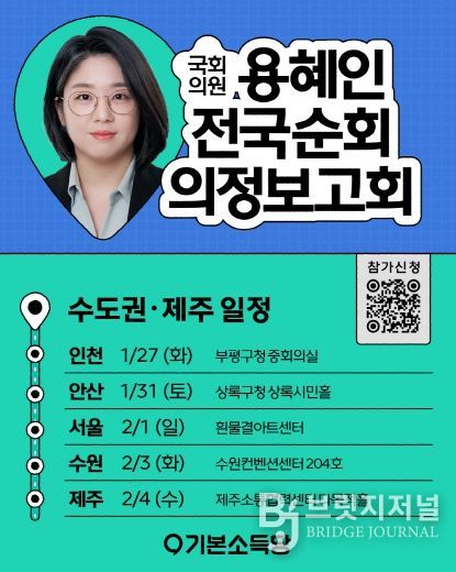 브릿지저널 김경미 기자 | 기본소득당 용혜인 의원이 오는 1월 27일부터 2월 3일까지 인천광역시, 경기 안산시, 서울특별시, 경기 수원특례시를 차례로 찾아 '국민과 함께 한 걸음 더' 수도권 의정보고회를 연다.