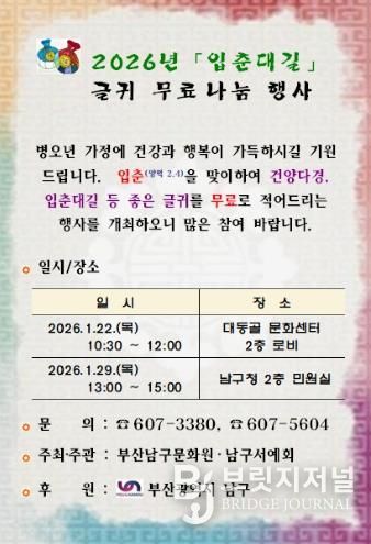 이번 행사는 부산남구문화원이 주최하고 남구문화예술회 서예회가 주관하며, 서예가들이 직접 참여해 전통의 멋과 정성을 담은 입춘방을 무료로 나눌 예정이다.