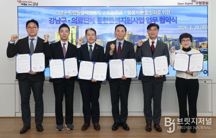 브릿지저널 김경미 기자 | 꿈이 모이는 도시, 미래를 그리는 강남구가 1월 20일 관내 5대 의료단체(강남구 의사회·치과의사회·한의사회·약사회·간호사회)와 ‘강남구 통합돌봄지원체계 구축을 위한 의료·요양 통합돌봄지원사업 업무협약(MOU)’을 체결했다.