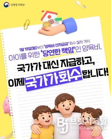 브릿지저널 김경미 기자 | 아이를 위한 '당연한 책임'인 양육비, 국가가 대신 지급하고, 이제 국가가 회수합니다!