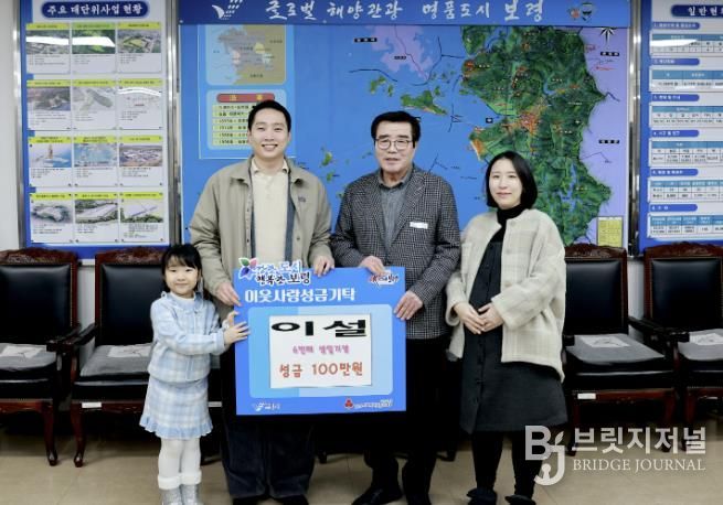 브릿지저널 정보영 기자 | 보령시는 지난 20일 시장실에서 이지원 씨와 배우자 고가슬 씨, 그리고 딸 이설 양이 참석한 가운데 ‘희망 나눔 캠페인’ 성금 전달식을 가졌다. 이날 이 씨 가족은 이설 양의 생일을 기념해 정성껏 마련한 성금 100만 원을 보령시에 기탁했다.
