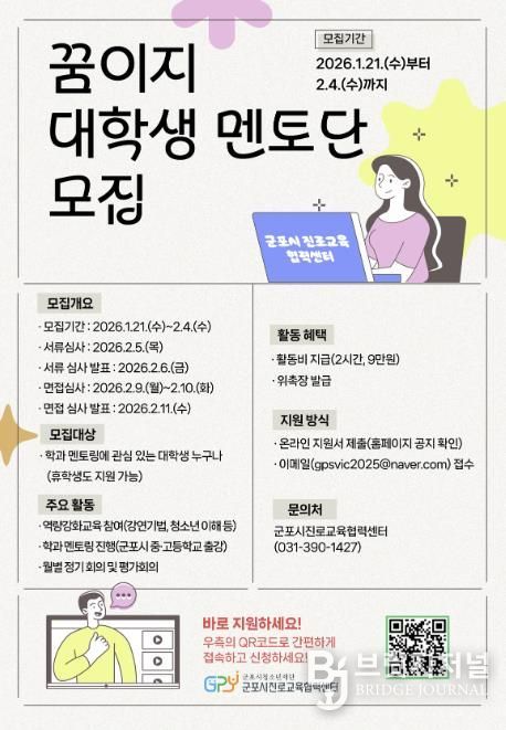 브릿지저널 김경미 기자 | (재)군포시청소년재단 군포시진로교육협력센터는 관내 청소년의 진로 탐색과 진로 역량 강화를 위해 '2026년 군포시진로교육협력센터 교육기부자'를 모집한다고 밝혔다.