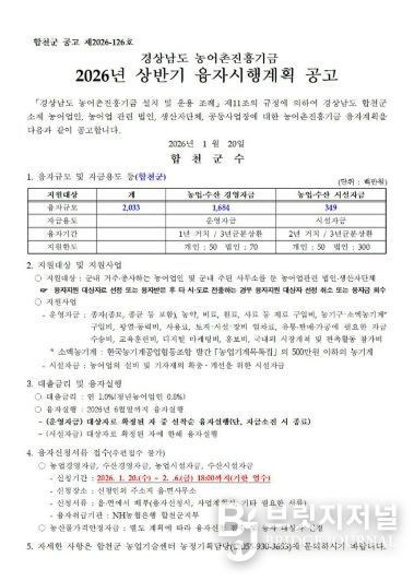 브릿지저널 김경미 기자 | 합천군은 1월 20일부터 2월 6일까지 경상남도 농어촌진흥기금 융자 신청을 읍·면사무소에서 접수한다.