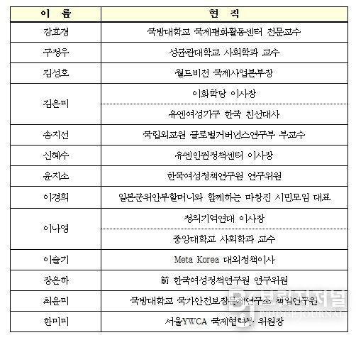 브릿지저널 김경미 기자 | '여성과 함께하는 평화 구상(Action with Women and Peace Initiative)' 2기 자문위원회가 1월 21일 출범했다. 금번에 출범한 2기 자문위원회는 여성‧평화‧안보, 인권, 개발협력, 사이버 등 분야에서 활동 중인 13명의 학계, 시민사회 등 민간 전문가로 구성되어 앞으로 동 구상 추진 과정에서 다양한 자문을 제공하게 된다.