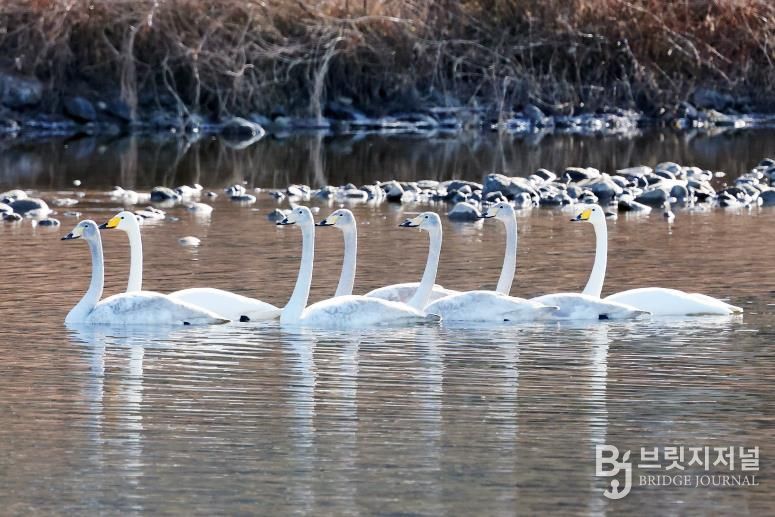 브릿지저널 김경미 기자 | 충북 괴산 달천강에 내려앉은 ‘겨울 진객’… 큰고니 가족의 평화로운 외출청정 괴산의 생태 지표로 주목영하권 추위가 몰아친 충북 괴산군 달천강변에 반가운 손님이 찾아왔다.