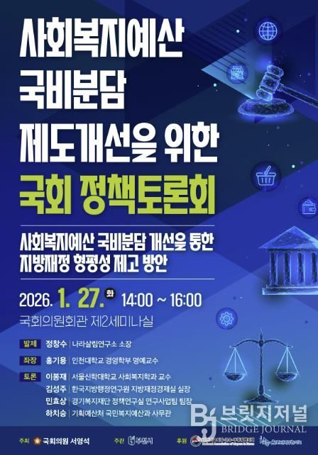아울러 사회복지예산 국비분담 제도의 현황과 과제를 짚고, 중앙정부와 지방정부 간 재정 책임을 합리적으로 조정할 수 있는 제도개선 방향에 관해 전문가 발제와 종합 토론도 예정돼 있다.