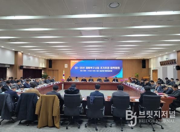 도는 23일 도청 대회의실에서 신일호 안전기획관 주재로, 도 관련 부서 및 시군 과장들이 참석한 가운데 ‘재해복구사업 조기 추진 대책회의’를 개최했다.