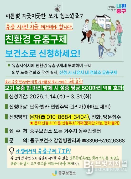 브릿지저널 김경미 기자 | 서울 중구가 지난해 큰 호응을 얻은 겨울철 '찾아가는 방역특공대'를 올해도 이어간다. 방역특공대는 1월부터 4월까지 친환경 약품을 사용해 주거밀집 지역의 모기 유충구제에 나선다. 겨울 유충구제를 위해서는 3월 31일까지 신청해야 한다.