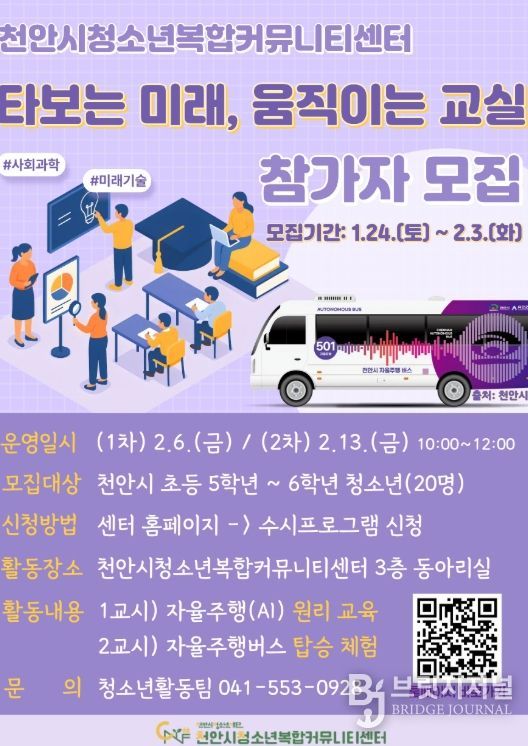 브릿지저널 정보영 기자 | (재)천안시청소년재단 천안시청소년복합커뮤니티센터가 겨울방학을 맞아 자율주행버스를 직접 타보고 미래 기술을 배우는 ‘타보는 미래, 움직이는 교실’ 참가자를 모집한다고 26일 밝혔다.