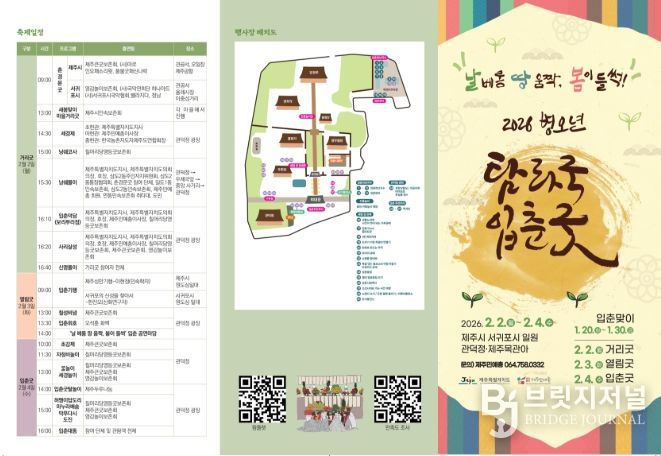 브릿지저널 정보영 기자 | 제주특별자치도는 2026 병오년 탐라국 입춘굿을 (사)제주민예총(이사장 송맹석) 주최·주관으로 "날 베롱 땅 움짝, 봄이 들썩”주제로 2월 2일부터 2월 4일까지 관덕정, 제주목 관아지 등 도내 일원에서 개최한다고 밝혔다.
