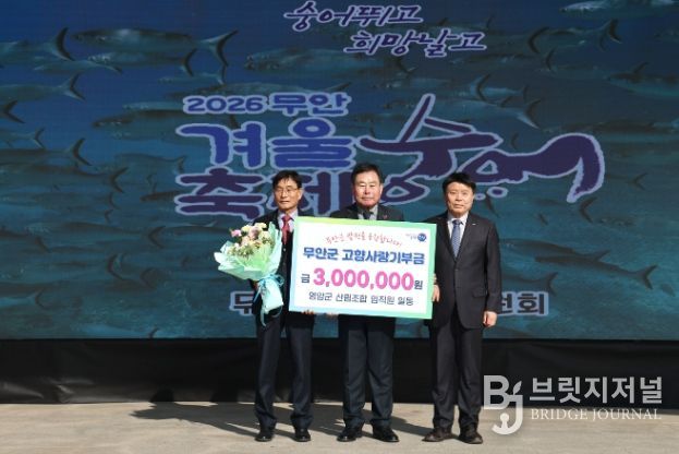 브릿지저널 김경미 기자 | 무안군은 지난 24일 열린 ‘2026 무안겨울숭어축제’를 계기로 영암군 산림조합 임직원들이 지역 간 상생 발전과 기부문화 확산을 위해 무안군 고향사랑기부금 300만 원을 기탁했다고 밝혔다.