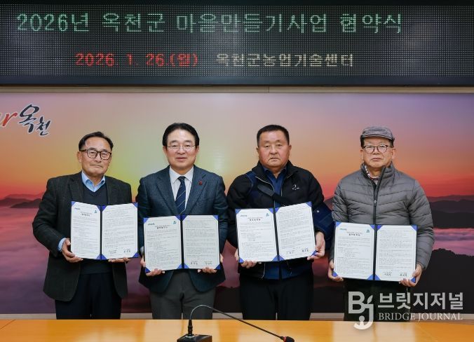 브릿지저널 김경미 기자 | 옥천군은 1월 26일 오후 2시, 옥천군농업기술센터 2층 소회의실에서 ‘2026년 옥천군 마을만들기사업 협약식’을 열고 동이면 금암2리, 안남면 도덕1리, 청산면 한곡리 등 3개 마을과 협약을 체결했다.