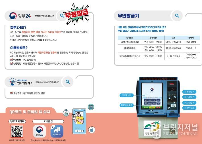브릿지저널 정보영 기자 | 금산군 금산읍은 주민들의 편의성과 효율성 증대를 위해 정부24 및 무인민원발급기 이용 방법 안내에 나서고 있다.