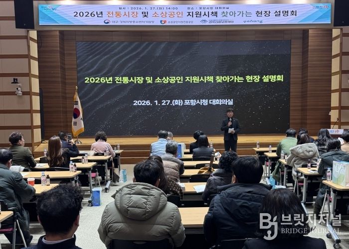 브릿지저널 정보영 기자 | 포항시는 27일 시청 대회의실에서 대구경북지방중소벤처기업청 주관으로 ‘2026년 전통시장·소상공인 찾아가는 현장설명회’를 개최하며 지역 상인들의 정책 접근성 강화에 나섰다.