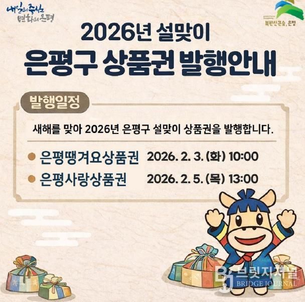 브릿지저널 김경미 기자 | 서울 은평구는 설 명절을 맞아 오는 2월 첫째 주에 은평땡겨요상품권과 은평사랑상품권을 발행한다고 밝혔다.