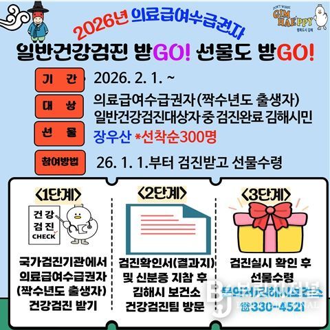 브릿지저널 김경미 기자 | 김해시보건소는 2026년 새해를 맞아 의료 취약계층의 질병을 조기에 발견하고 예방하기 위해 의료급여수급권자를 대상으로 『일반건강검진 받GO! 선물도 받GO!』 이벤트를 실시한다고 밝혔다.
