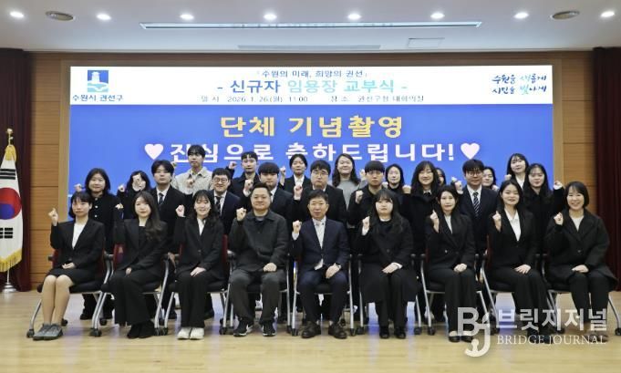 브릿지저널 김경미 기자 | 수원시 권선구는 지난 26일, 권선구청 2층 대회의실에서 신규 공직자 27명이 참석한 가운데 임용장 수여식을 개최했다.