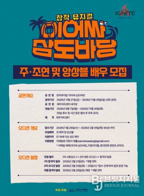 브릿지저널 정보영 기자 | 제주아트센터는 올해 11월 개최 예정인 창작뮤지컬 ‘이어싸 삼도바당’에 참여할 배우를 모집하고, 공연 오디션을 진행한다.