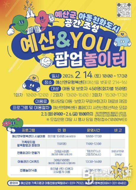브릿지저널 정보영 기자 | 예산군은 아동친화도시 공간 조성의 하나로 아동과 가족이 함께 즐길 수 있는 ‘예산앤유(&YOU) 팝업(한시운영) 놀이터’를 2월 14일 예산앤유행복센터에서 운영한다고 밝혔다.