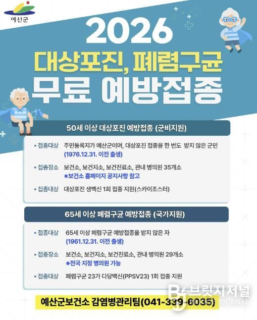 브릿지저널 정보영 기자 | 예산군은 면역력이 약해지는 중장년층과 어르신들의 건강 보호를 위해 대상포진 및 폐렴구균 무료 예방접종을 연중 실시하며 군민들의 적극적인 참여를 당부했다.