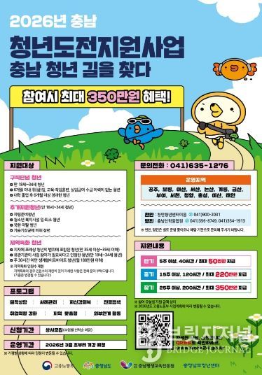 충남청년센터는 구직에 어려움을 겪는 지역 청년들을 대상으로 ‘청년도전지원사업’ 참여자를 모집한다고 밝혔다.
