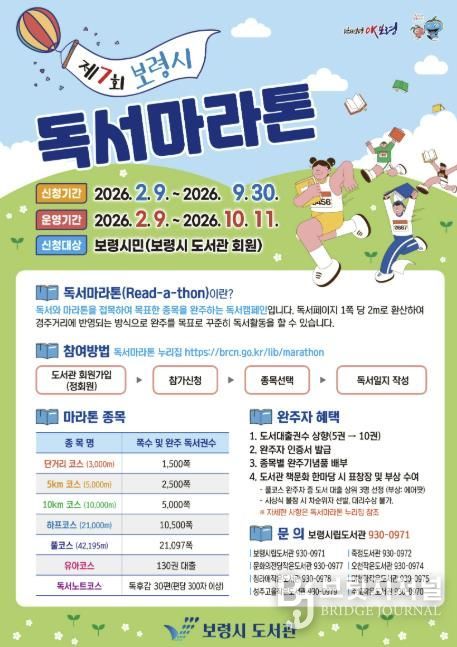브릿지저널 정보영 기자 | 보령시는 시민들의 독서 문화 활성화를 위해 오는 2월 9일부터 10월 11일까지 245일간 ‘제7회 독서마라톤’을 개최한다.