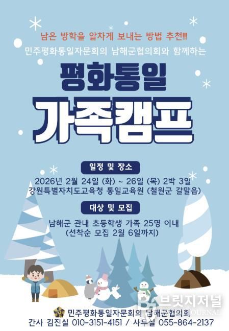 브릿지저널 김경미 기자 | 민주평화통일자문회의 경남남해군협의회는 관내 초등학생과 그 가족을 대상으로 ‘2026 평화통일 가족캠프’ 참가자를 모집한다고 밝혔다.