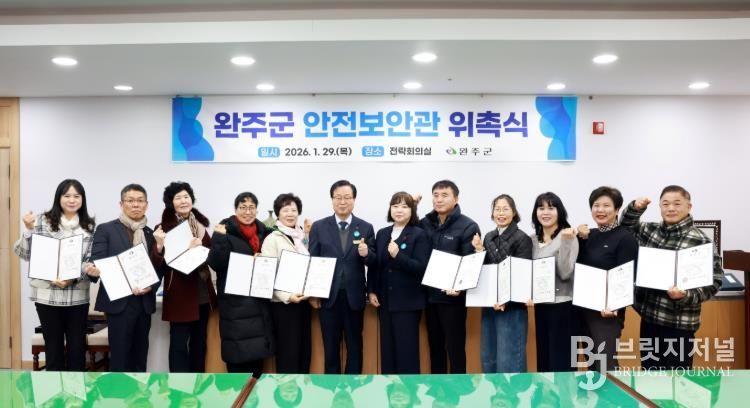 브릿지저널 윤나영 기자 | 완주군이 ‘2026년 완주군 안전보안관 위촉식’을 열고 신규 안전보안관 12명에게 위촉장을 수여했다.