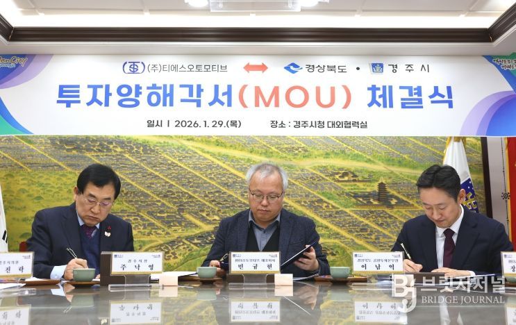 경주시는 29일 시청 대외협력실에서 경북도와 함께 자동차 차체 부품 전문기업 ㈜티에스오토모티브 간 전기차 신차종 제품 생산라인 구축을 위한 투자양해각서(MOU)를 체결했다.