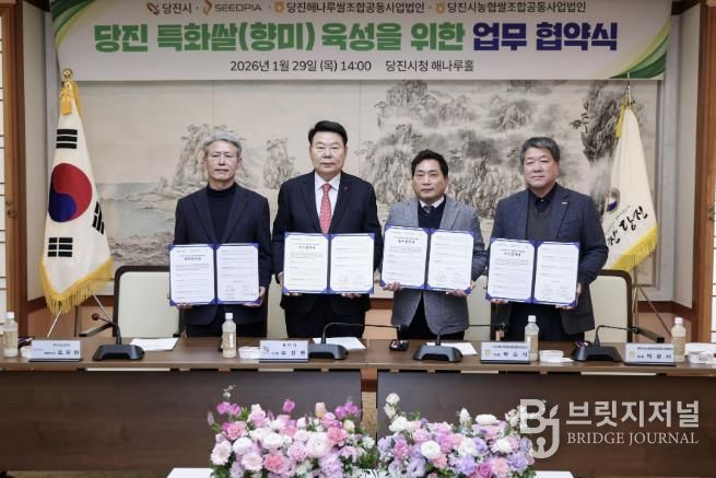브릿지저널 정보영 기자 | 당진시는 지난 29일 당진시청 해나루홀에서 ㈜시드피아, 통합RPC와 함께 ‘신품종 벼 실증 및 유통 활성화’를 위한 3자 간 업무협약을 체결했다고 30일 밝혔다.
