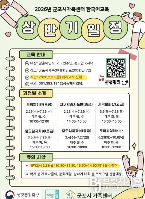 브릿지저널 김경미 기자 | 군포시가족센터는 결혼이민자, 중도입국자녀, 외국인주민을 대상으로 수준별·목적별 한국어교육과 한국사회 적응을 돕는 통합 프로그램을 운영한다.