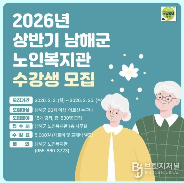 브릿지저널 김경미 기자 | 남해군 노인복지관은 2026년 상반기 프로그램 수강생을 2월 2일부터 25일까지 모집한다고 밝혔다.