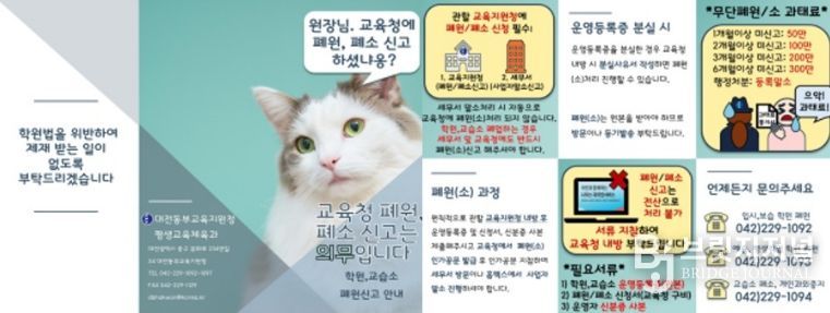 브릿지저널 정보영 기자 | 대전동·서부교육지원청은 관내 세무서와 협조하여 세무서 민원실에 학원·교습소 폐원 및 폐소 안내 리플릿을 비치한다고 밝혔다.
