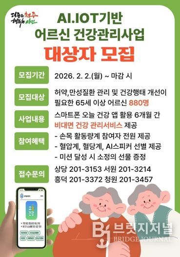 브릿지저널 김경미 기자 | 청주시 보건소는 2월 2일부터 65세 이상 어르신을 대상으로 하는 인공지능(AI)·사물인터넷(IoT) 기반 어르신 건강관리사업 참여자 880명을 모집한다.