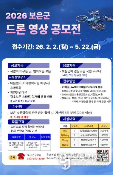 브릿지저널 김경미 기자 | 충북 보은군은 드론 영상을 통해 지역의 변화와 매력을 전국에 알리기 위해 ‘2026 보은군 드론 영상 공모전’을 개최하고, 오는 2월 2일부터 작품 접수를 시작한다.