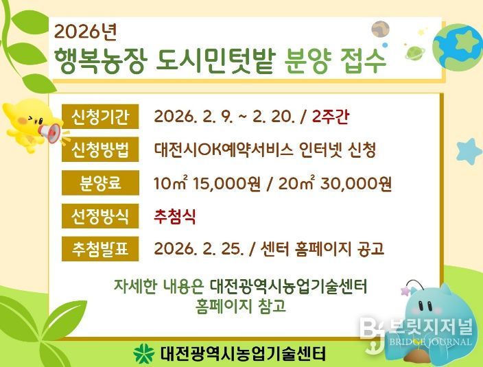 브릿지저널 정보영 기자 | 대전시농업기술센터는 도심속 농업․농촌 체험을 통한 도시농업 확산을 위해 2월 9일부터 대전시민을 대상으로 행복농장(도시민텃밭) 참가자 110세대를 모집한다.
