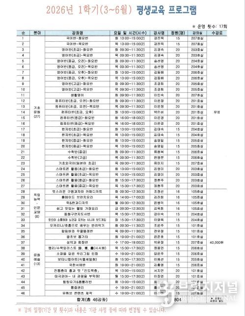 이번 학기에는 공모를 통해 선정된 46개 프로그램과 지역 우수강사의 재능을 활용한 12개 재능기부 프로그램 등 총 58개 강좌를 운영한다. 교육 과정은 영어 및 컴퓨터 등 기초문해 과정, 요리 및 동화구연지도사 등 직업능력·인문교양 과정, 통기타·민화·태극권 등 문화예술 과정으로 구성했다. 상반기 교육은 3월 3일부터 6월 29일까지 17주간 진행할 예정이다.