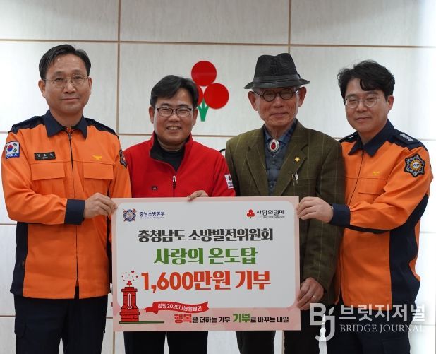 브릿지저널 정보영 기자 | 충청남도 소방발전위원회(소방정책 자문·협의기구)는 지난 30일 연말연시 이웃돕기 성금 모금인 ‘사랑의 온도탑’에 성금 1600만 원을 기탁했다고 1일 밝혔다.