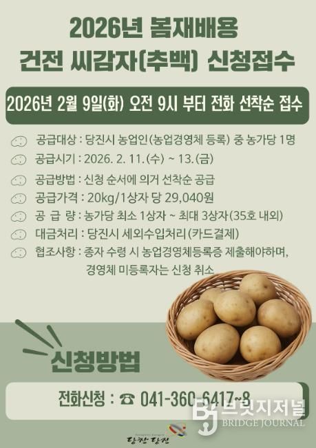 브릿지저널 정보영 기자 | 당진시는 봄 재배용으로 활용될 조직배양 ‘추백’ 씨감자 원종 2톤을 관내 농가에 공급하기 위해 오는 9일 오전 9시부터 선착순으로 신청을 받는다고 3일 밝혔다.