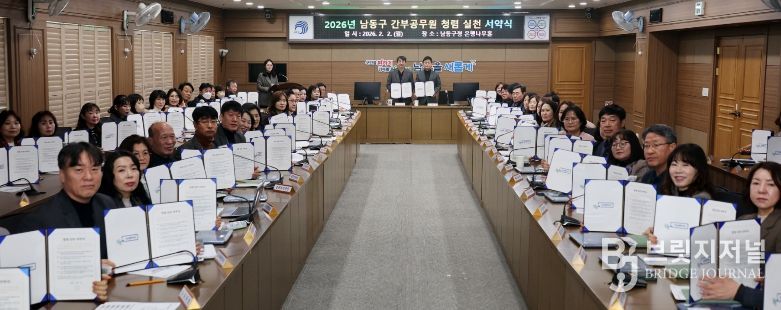 브릿지저널 김경미 기자 | 인천시 남동구는 2026년 청렴정책추진단 회의 및 간부 공무원 청렴 서약식을 개최하고, 기관장과 간부 공무원을 중심으로 책임 있는 청렴 실천 의지를 다졌다고 3일 전했다.